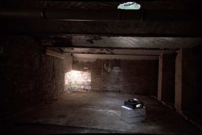 An image of a Berlin courtyard‘s wall corner, normally hidden for the public, is being projected onto the wall corner of a cellar in the exact same building, one floor below the regular exhibition space. The different height levels, types of wall structures and also the plants growing outside melt through the projection on the cellar‘s mouldy brick wall.