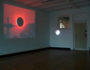 Video loop of a very fast sequence of sunset and dawn. A styrofoam ball hangs from the ceiling on a thin thread. When the sun reaches its highest point, the projected image disappears on the ball. The black spot