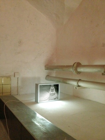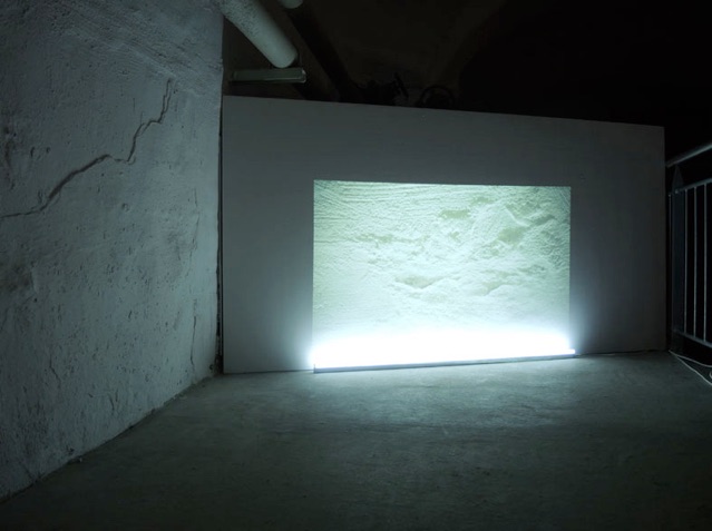 The slides show details of the whitened walls in the basement. In detail, the wall texture, engraved with bumps and holes, rests of color, and smear traces, suggests the impression of a cartography of islands, snowd in mountains, sheets of ice or surfaces of planets. The bright, artificial ight from the LED lamp, lying on the ground in front of the projection, sends out hus rays into the slide projection, which on the other hand is melting with the wall’s texture.