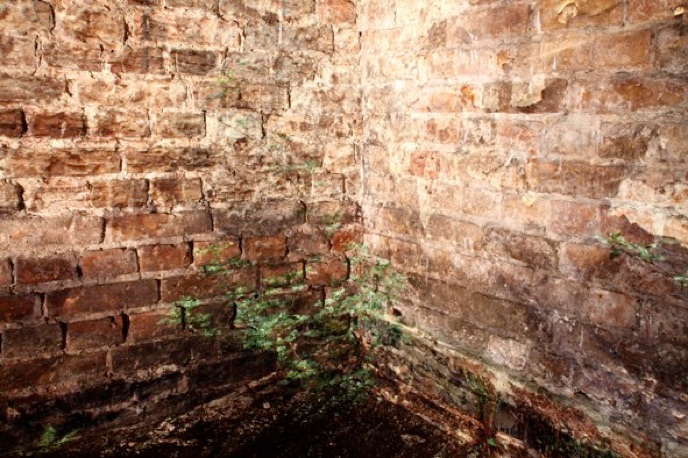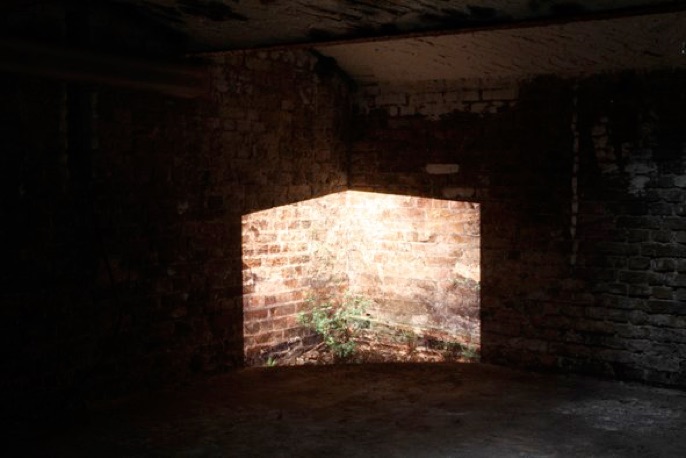 An image of a Berlin courtyard‘s wall corner, normally hidden for the public, is being projected onto the wall corner of a cellar in the exact same building, one floor below the regular exhibition space. The different height levels, types of wall structures and also the plants growing outside melt through the projection on the cellar‘s mouldy brick wall.