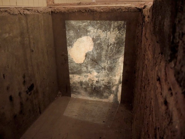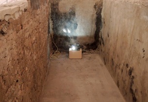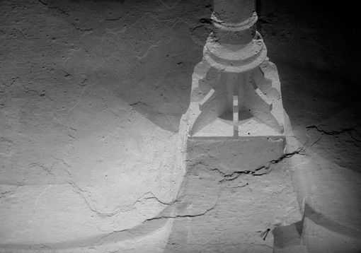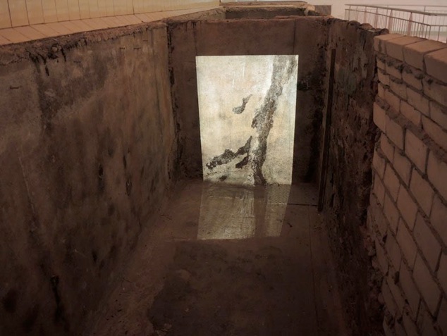 The slides show details of the whitened walls in the basement. In detail, the wall texture, engraved with bumps and holes, rests of color, and smear traces, suggests the impression of a cartography of islands, snowd in mountains, sheets of ice or surfaces of planets. The bright, artificial ight from the LED lamp, lying on the ground in front of the projection, sends out hus rays into the slide projection, which on the other hand is melting with the wall’s texture.