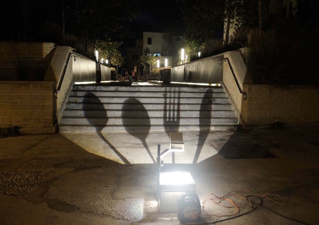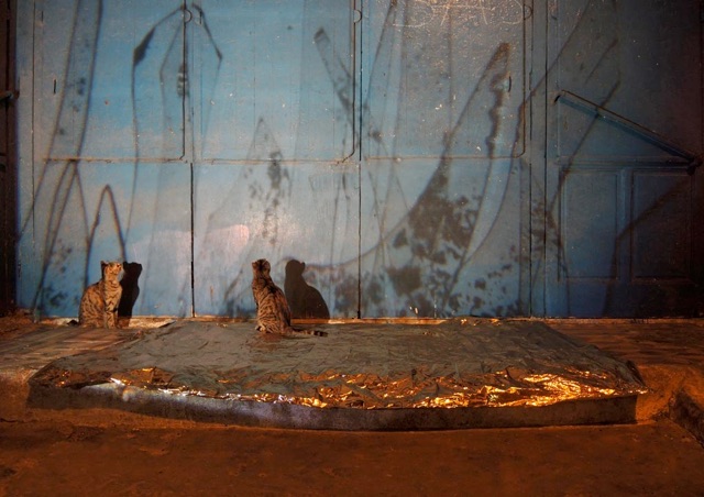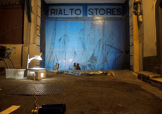 Overhead projector, shattered glass pieces, gold foil, and visiting street cats.