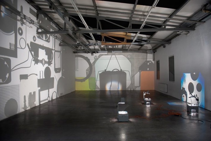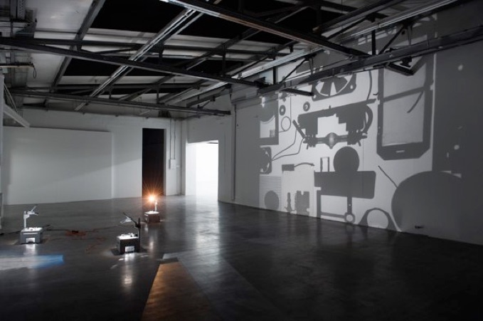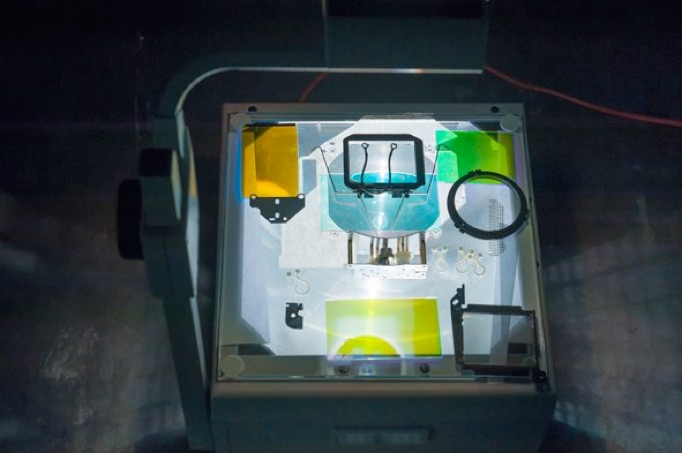 Three overhead projectors, inner parts of two video beamers. Site specific installation.