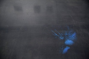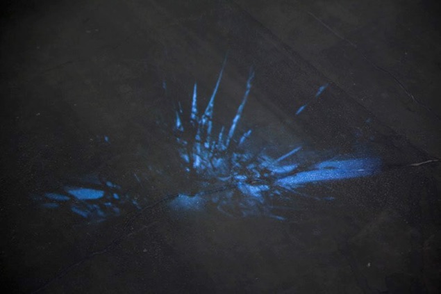 Broken security glass plates were scanned with a regular scanner, lid open. This process was filmed and edited for the video loop, which was projected on the floor. The light, slowly moving under the glass cracks, slowly scanning its structures, brings to mind the walk on broken ice or aerial photos of city- and landscapes.