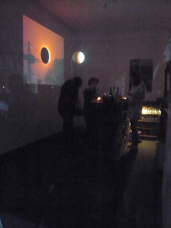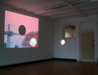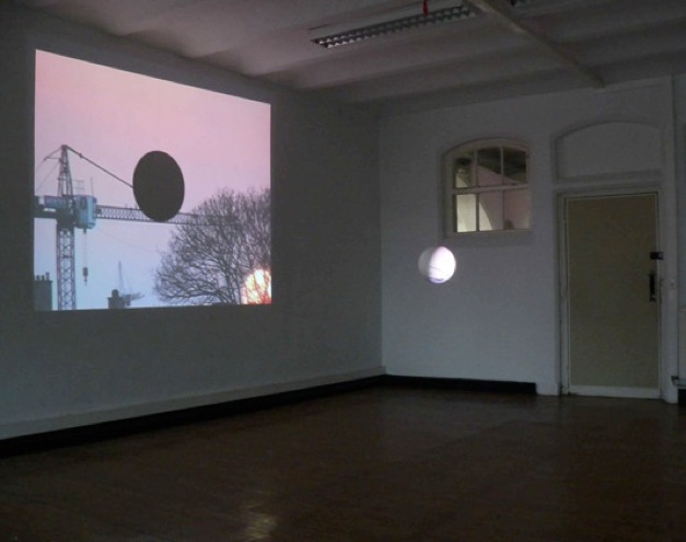 Video loop of a very fast sequence of sunset and dawn. A styrofoam ball hangs from the ceiling on a thin thread. When the sun reaches its highest point, the projected image disappears on the ball. The black spot