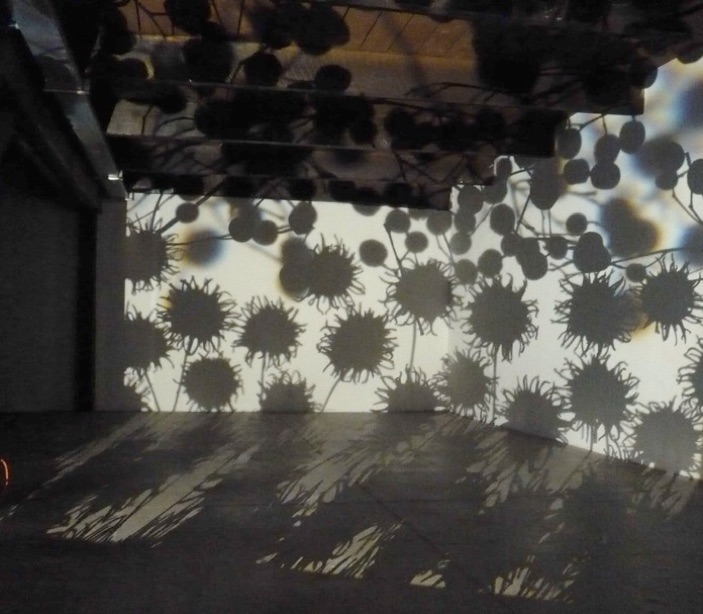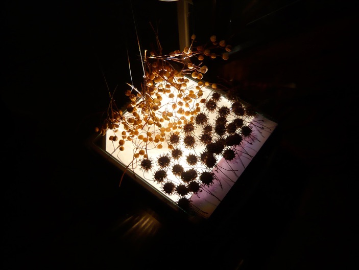 Overhead projector, berries and other parts of plants fallen from trees, hanging from nylon threads
